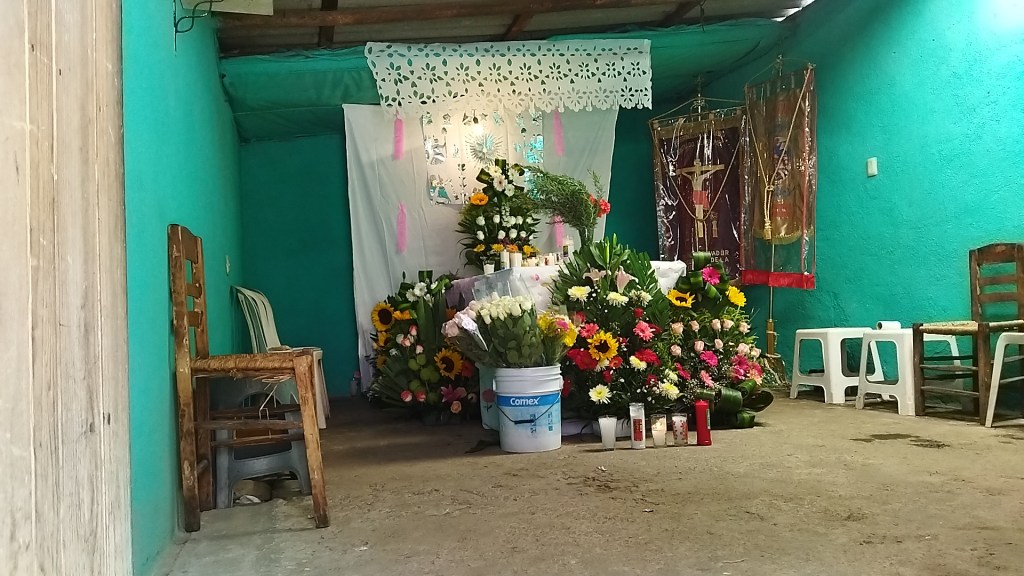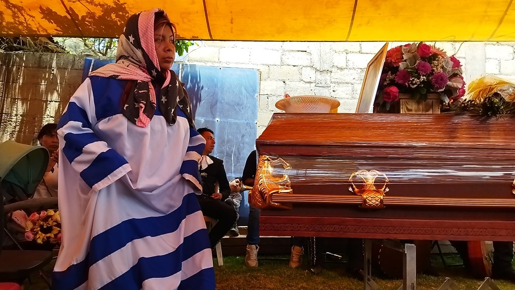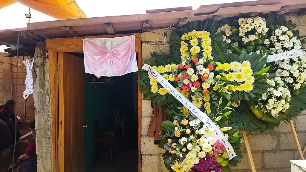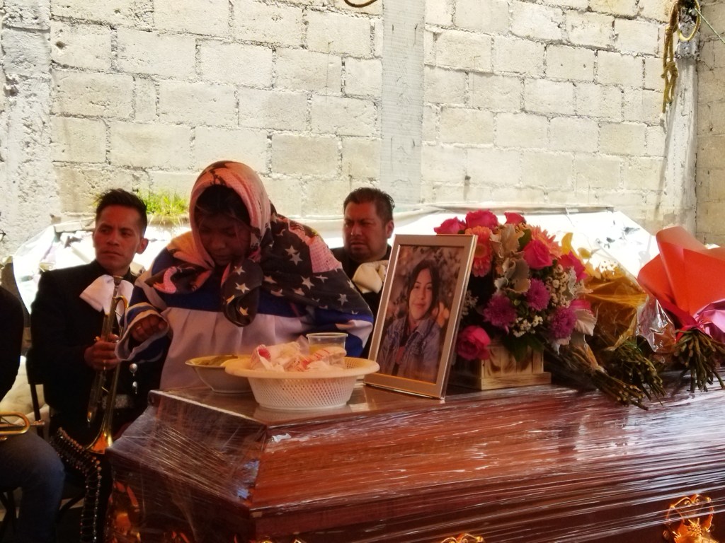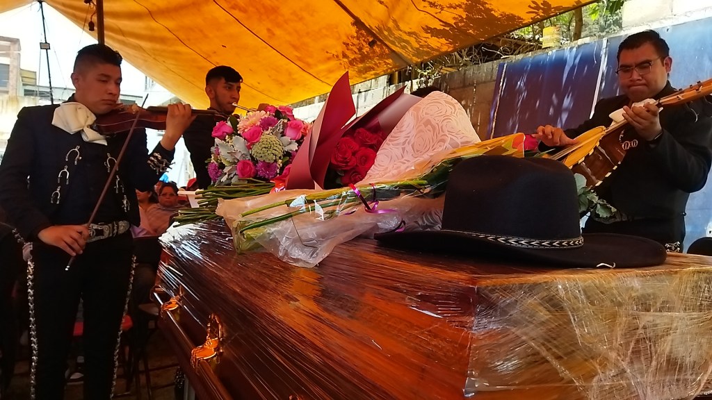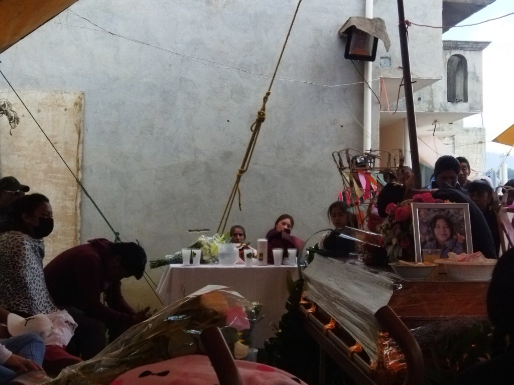 Allí en el patio, hay un joven que le llora y le canta al cajón de Ameyali. Allí está una joven que le baila los chinelos moviendo los pies al compás de un son. Allí está el cuerpo de Itzel Ameyali rodeado de flores, con su tejana negra encimado en el descanso del ataúd.