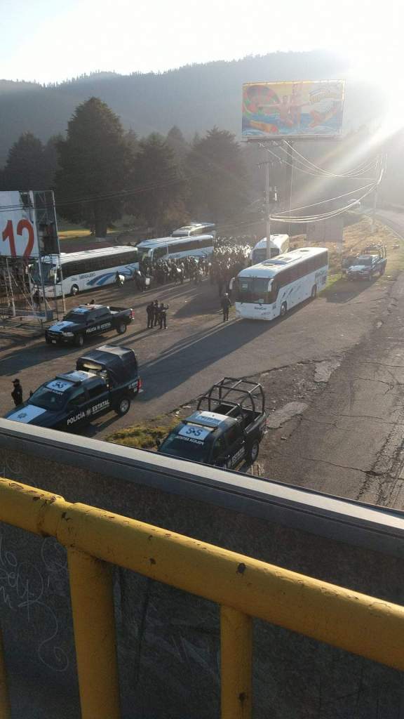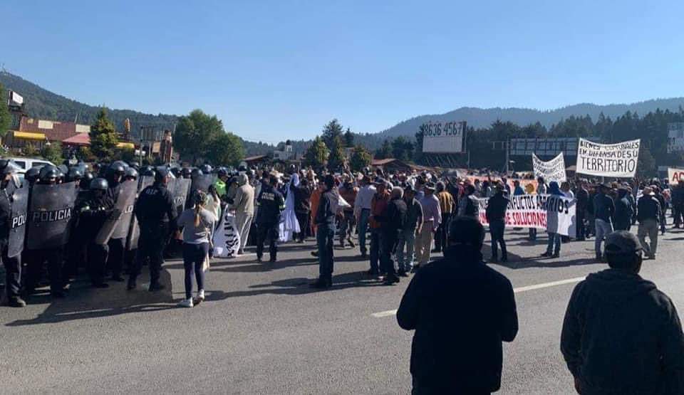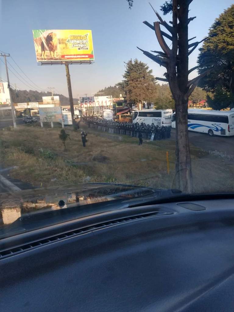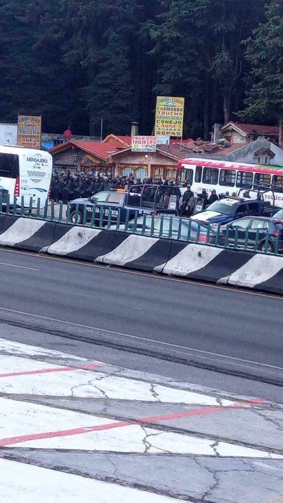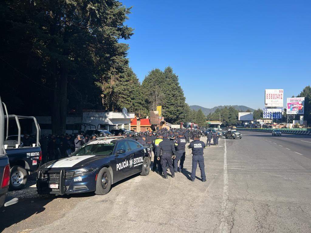 Más de 200 elementos de la Secretaría de Seguridad del Estado de México custodian la zona de las Alas en la México-Toluca por bloqueo de comuneros de San Jerónimo Acazulco este jueves a la altura de La Marquesa.
