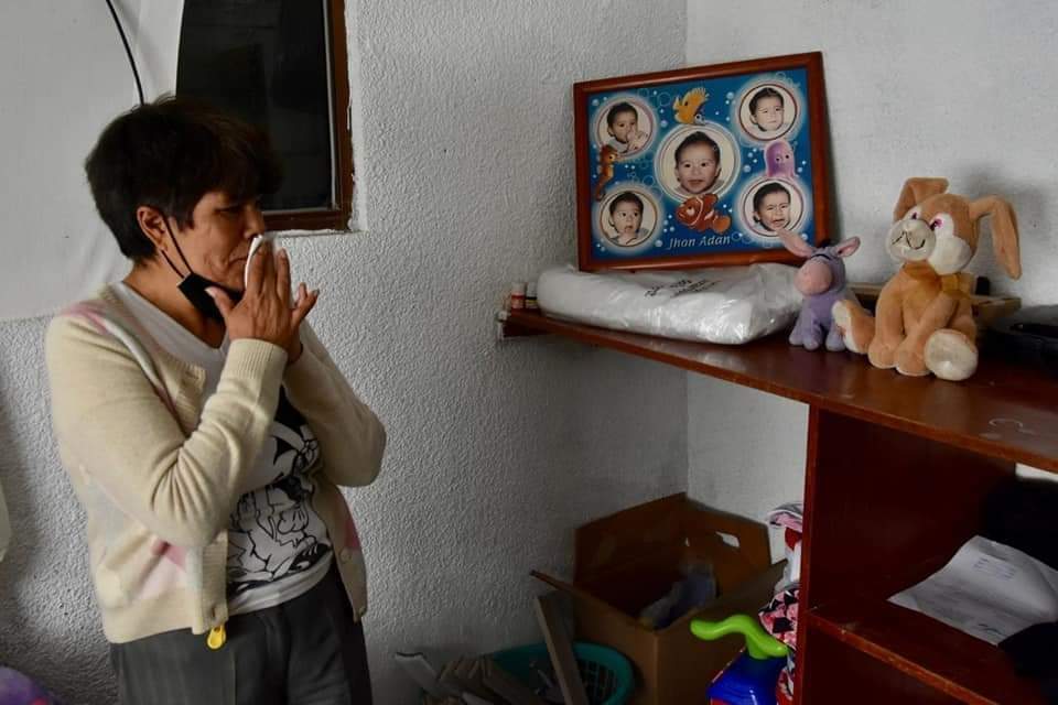 Juana se recoge las lágrimas y luego recoge unas playeras y unos tenis en el cuarto de su hijo, donde pareciera que no se quiere que pase el tiempo. Sobre la cama está la mochila de Jhon, también su cartera y sus libretas de la escuela.