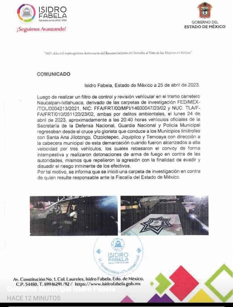 Luego de realizar un filtro de control y revisión vehicular en el tramo carretero Naucalpan-Ixtlahuaca, derivado de las carpetas de investigación 𝗙𝗘𝗗/𝗠𝗘𝗫/𝗧𝗢𝗟/𝟬𝟬𝟬𝟰𝟮𝟭𝟯/𝟮𝟬𝟮𝟭, 𝗡𝗜𝗖: 𝗙𝗙𝗔/𝗙𝗥𝗧/𝟬𝟬/𝗠𝗣𝗜/𝟭𝟰𝟲𝟬𝟬𝟬𝟰𝟳/𝟮𝟯/𝟬𝟮 y 𝗡𝗨𝗖: 𝗧𝗟𝗔/𝗙𝗙𝗔/𝗙𝗥𝗧/𝟬𝟭𝟬/𝟬𝟱𝟭𝟭𝟮𝟬/𝟮𝟯/𝟬𝟮, ambas por delitos ambientales, el lunes 24 de abril de 2023, aproximadamente a las 20:40 horas, vehículos oficiales de la Secretaría de la #DefensaNacional, #GuardiaNacional y #PolicíaMunicipal, regresaban del operativo desde el cruce y/o glorieta que conduce a los Municipios limitrofes de Santa Ana Jilotzingo, Otzolotepec, Jiquipilco y Temoaya con dirección a la cabecera municipal de esta demarcación cuando fueron alcanzados por tres vehículos a alta velocidad, los cuales rebasaron el convoy de forma intempestiva y realizaron detonaciones de arma de fuego en contra de los oficiales, mismos que repelieron la agresión con la finalidad de evadir y disuadir el riesgo inminente de los efectivos.