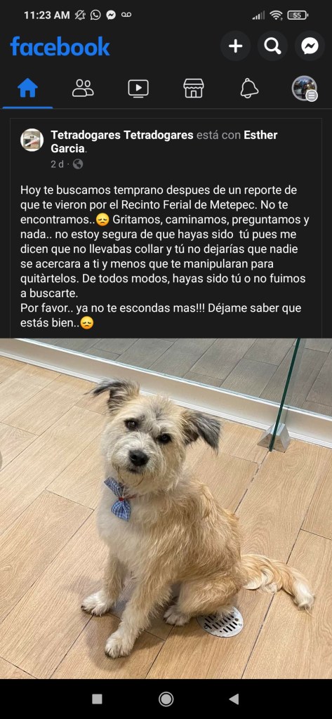 «Hoy te buscamos temprano despues de un reporte de que te vieron por el Recinto Ferial de Metepec. No te encontramos.. Gritamos, caminamos, preguntamos y nada.. no estoy segura de que hayas sido tú pues me dicen que no llevabas collar y tú no dejarías que nadie se acercara a ti y menos que te manipularan para quitártelo. De todos modos, hayas sido tú o no fuimos a buscarte.