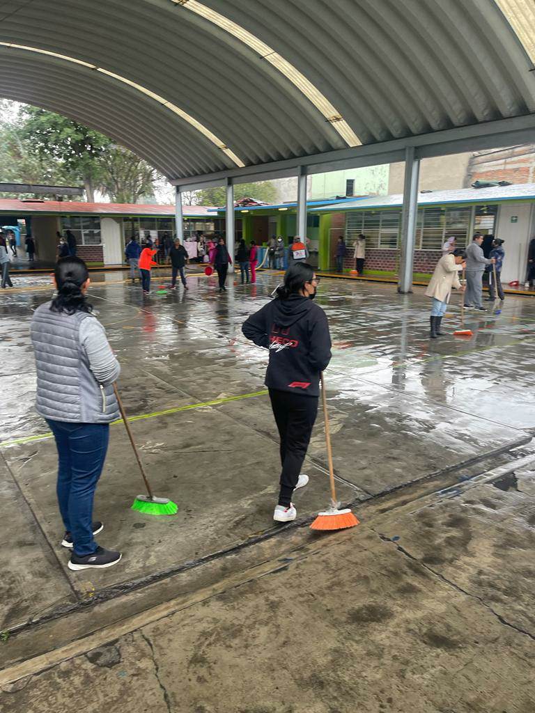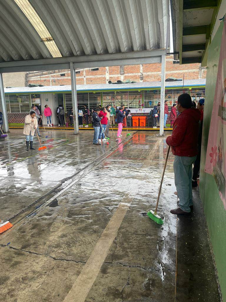 La Primaria Josefa Ortiz de Domínguez, ubicada en la avenida Isidro Fabela, en la colonia Los Ángeles #Toluca, se inundó con las lluvias de ayer y este martes las madres de familia tuvieron que hacer faena para retirar el agua de drenaje.