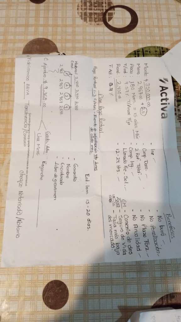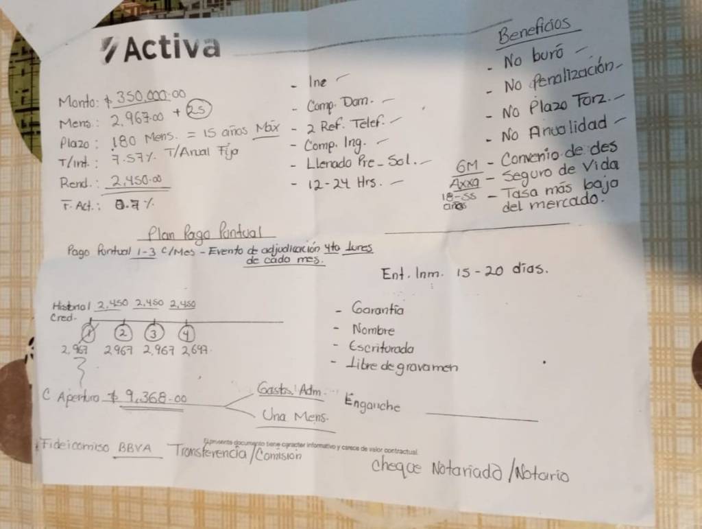 En ese primer encuentro con la financiera Activa a Teresa le hicieron un desglose mediante una tabla escrita al reverso de los folletos de la financiera. Prácticamente un borrador de escuela en el que le señalaban los plazos y montos, así como intereses a pagar.