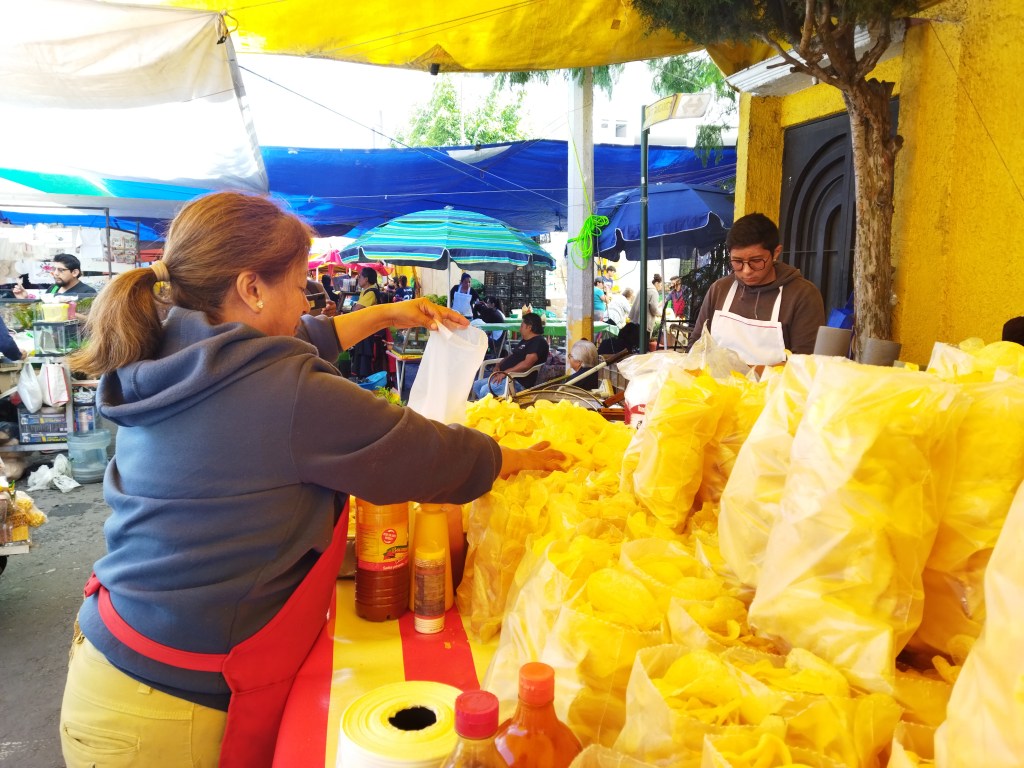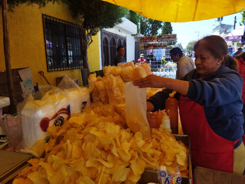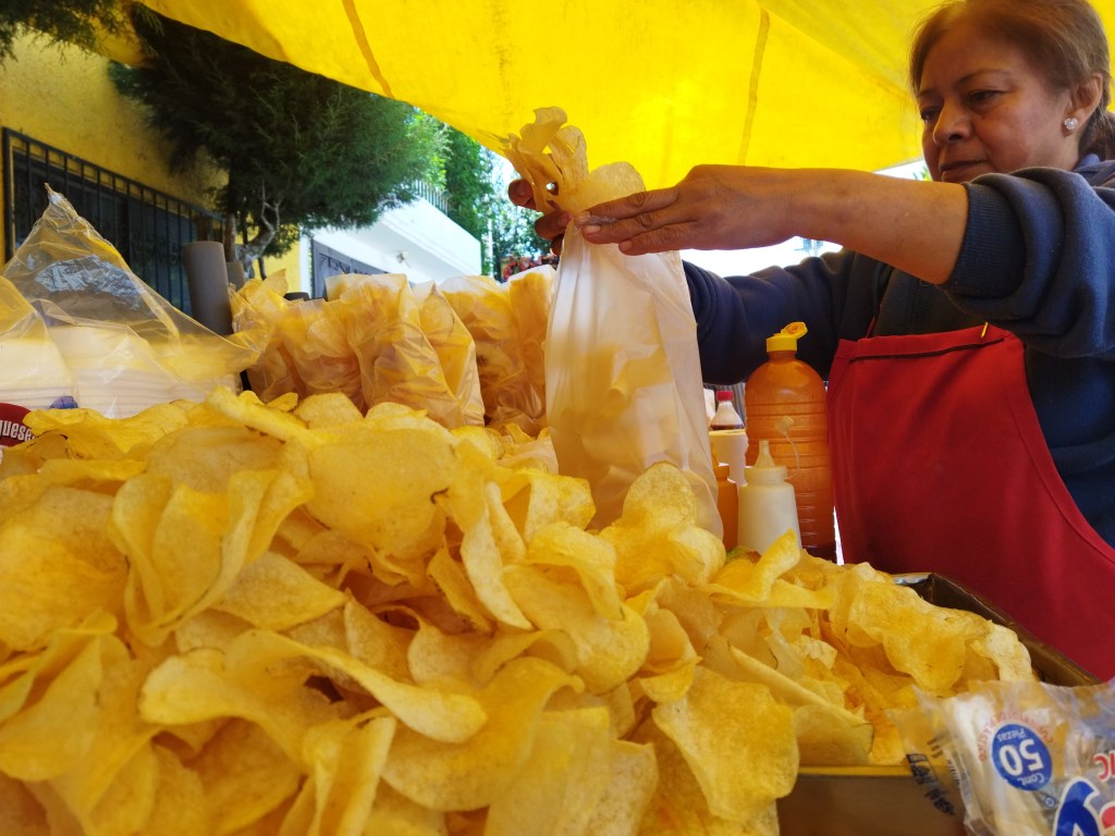 La marca de Sabritas nos quiere hacer competencia, dice don Héctor González sonriente pelando sus papas.