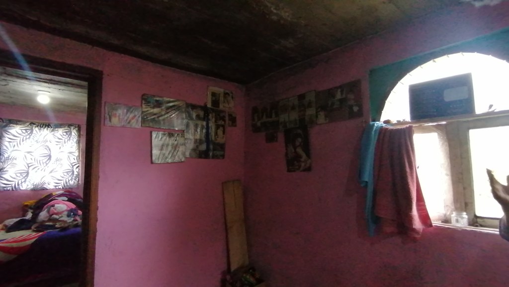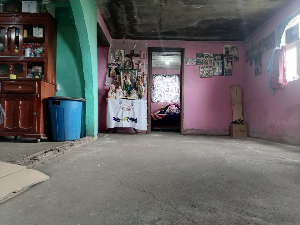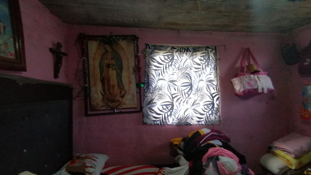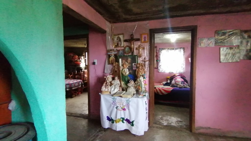 En dos paredes sus retratos familiares y en el otro sus santos: el santo Niño, la Virgen de Guadalupe y San Judas. Al otro extremo unos trasteros con unas cuantas caserolas colgadas.
