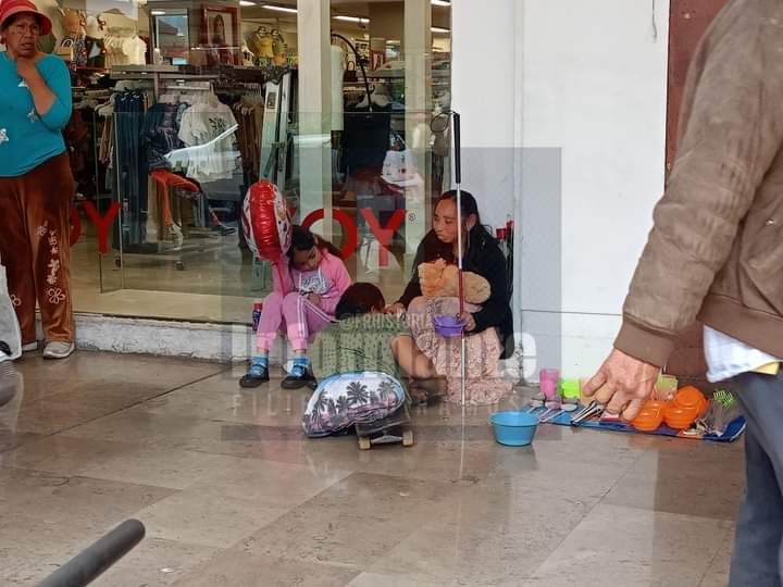 Chuchín no tiene piernas y a diario rueda en el piso de los Portales para subsistir con las monedas que le echan a su jícara. Se estira desde su patineta para entregarle el globo que recojió una pequeña y se lo sostiene a la joven.