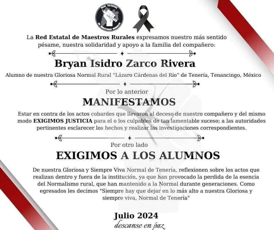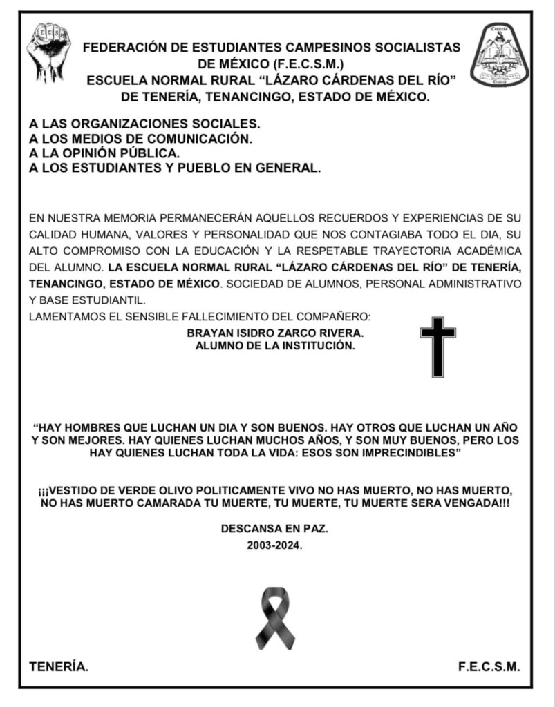 La institución, inicialmente, intentó mantener el incidente en silencio. Sin embargo, tras la presión de alumnos, docentes y padres de familia, la Escuela Normal Rural de Tenería emitió un comunicado confirmando la trágica muerte de Brayan y anunciando la cancelación del baile de graduación.