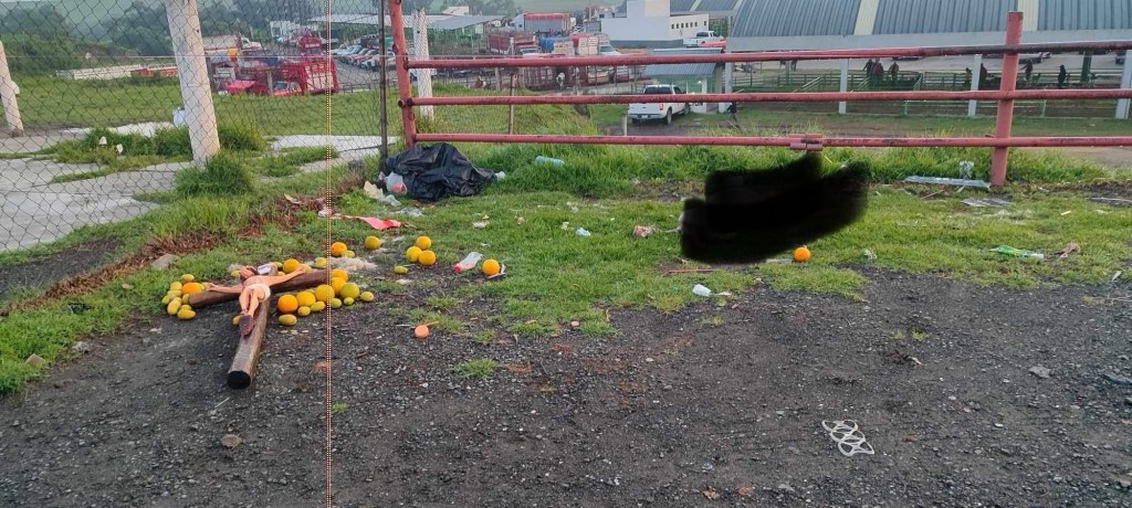 El hallazgo ocurrió la mañana del lunes, cuando se realizó el tianguis. Los comerciantes se sorprendieron al ver sobre el terreno un Cristo de gran tamaño rodeado de fruta y veladoras.