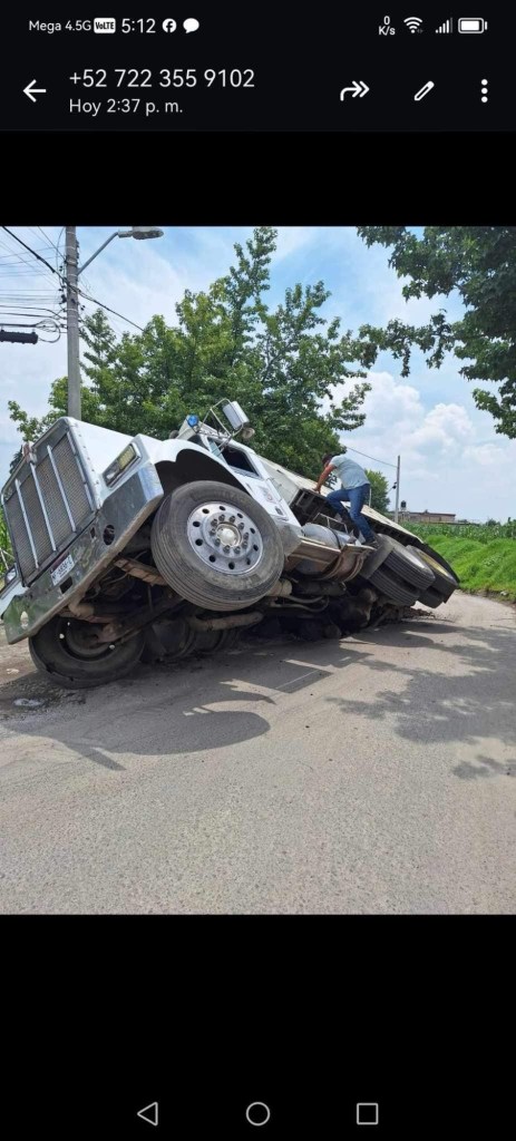 “Buenas tardes, quisiera saber si podrían ayudarme a publicar un abuso por parte de la delegada de Santa María Totoltepec. Estamos transportando material para una obra, al dar la vuelta sobre una calle un camión se hunde de la nada, los locatarios señalan que ya hay quejas y denuncias hacia la delegada por ignorar que ahí se forma un socabon, señalan que ya son muchas veces las que van a quejarse con ella que en temporada de lluvia al parecer se hunde y las casas ya presentan cierto nivel de hundimiento. Ahora la dichosa delegada abusando de su poder he influencia hace que los bomberos se nos lancen a los golpes, y nos quita el camión para obligarnos a pagar los supuestos daños ocasionados ya que ella señala que es culpa del camión. Siendo que ella ya tenía conocimiento sobre los daños que presenta su calle y el socabon ya presente, y ahora pretende que nosotros paguemos lo que a ella le corresponde, cabe señalar que la calle no estaba cerrada ni tampoco estaba presente ningún señalamiento que indicara el peligro. Adjunto evidencia. El camión fue llevado a el corralón de Zinacantepec y pretendía retener dos camiones más solo por sus huevos”.