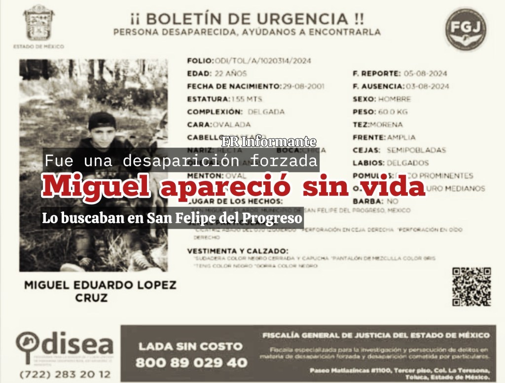 Miguel “N”, de 22 años, quien había desaparecido el pasado 3 de agosto en el municipio de San Felipe del Progreso, fue localizado sin vida, confirmaron sus familiares.