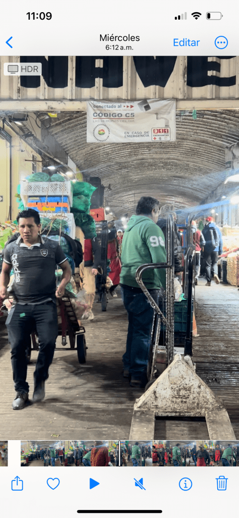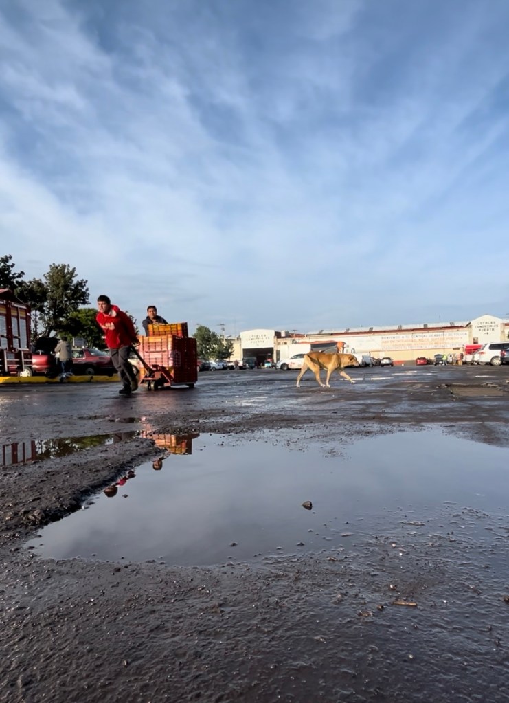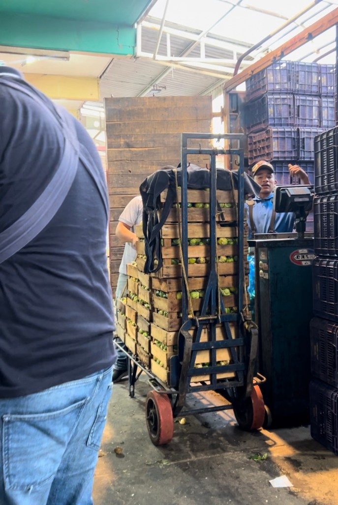 —¡Hay va el golpe! —grita “El Pelón», mientras cruza el pasillo de la nave “I” jalando su diablito con 300 kilos de verduras.