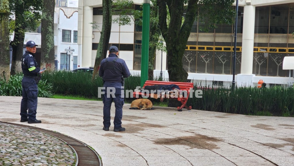 Una perrito atajado del frío con un chamarra tendida en el piso, espera a que su dueño despierte en una de las bancas de la Alameda Central de Toluca. Lo que el peludo no sabe es que el hombre ya falleció.
