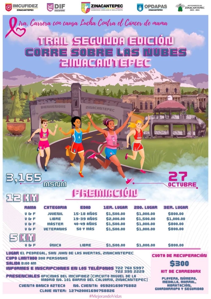 Este próximo 27 de Octubre en San Juan de las Huertas, municipio de Zinacantepec, el paraje conocido como El Pedregal será sede de la Segunda Edición del Trail Corriendo Sobre las Nubes #Zinacantepec 2024. Esta competencia es con causa ya que se busca apoyar la lucha contra el cáncer de mama.