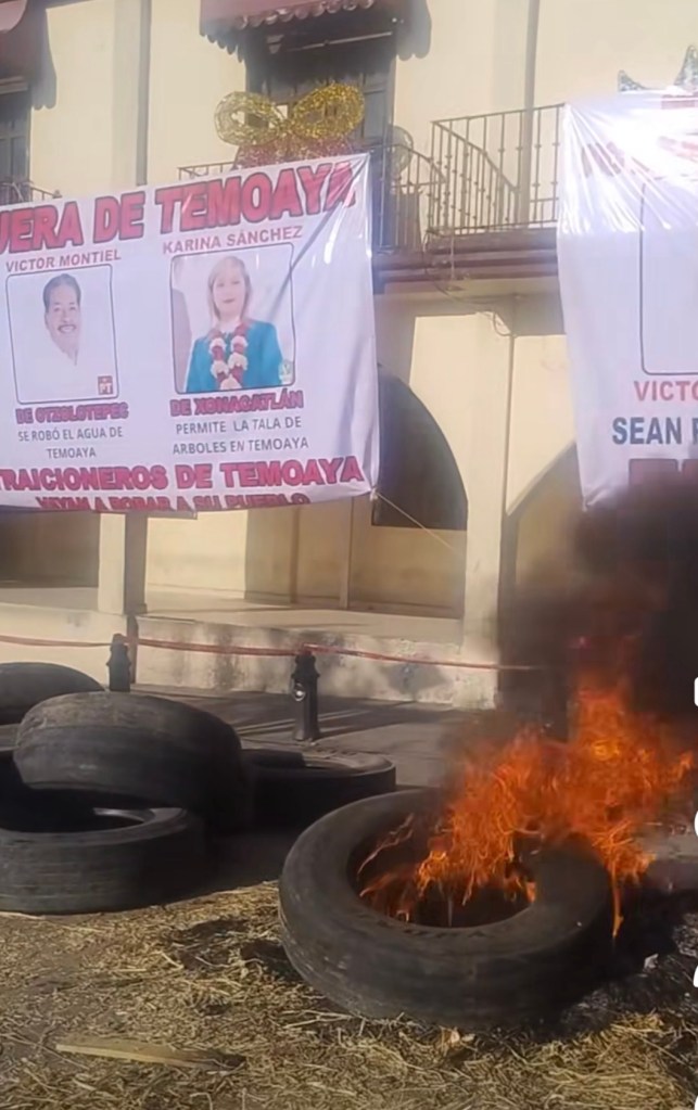 Un grupo de habitantes arribó esta mañana a la presidencia municipal de Temoaya, donde colocó mantas, realizó pintas y quemó llantas en contra de dos regidores, a los que denuncian por supuestos desvíos de fondos.
