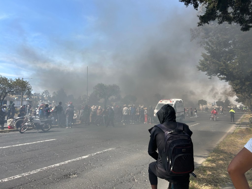 Aunque uno no quiera se rasca los ojos y pareciera que llora, porque las fumarolas negras de llantas cubren el cielo y casi debes fumar.ñ eso. También porque una niña que está arrodillada con el uniforme no deja de llorar sin consuelo en el asfalto de la carretera Toluca-Palmillas, gritando.