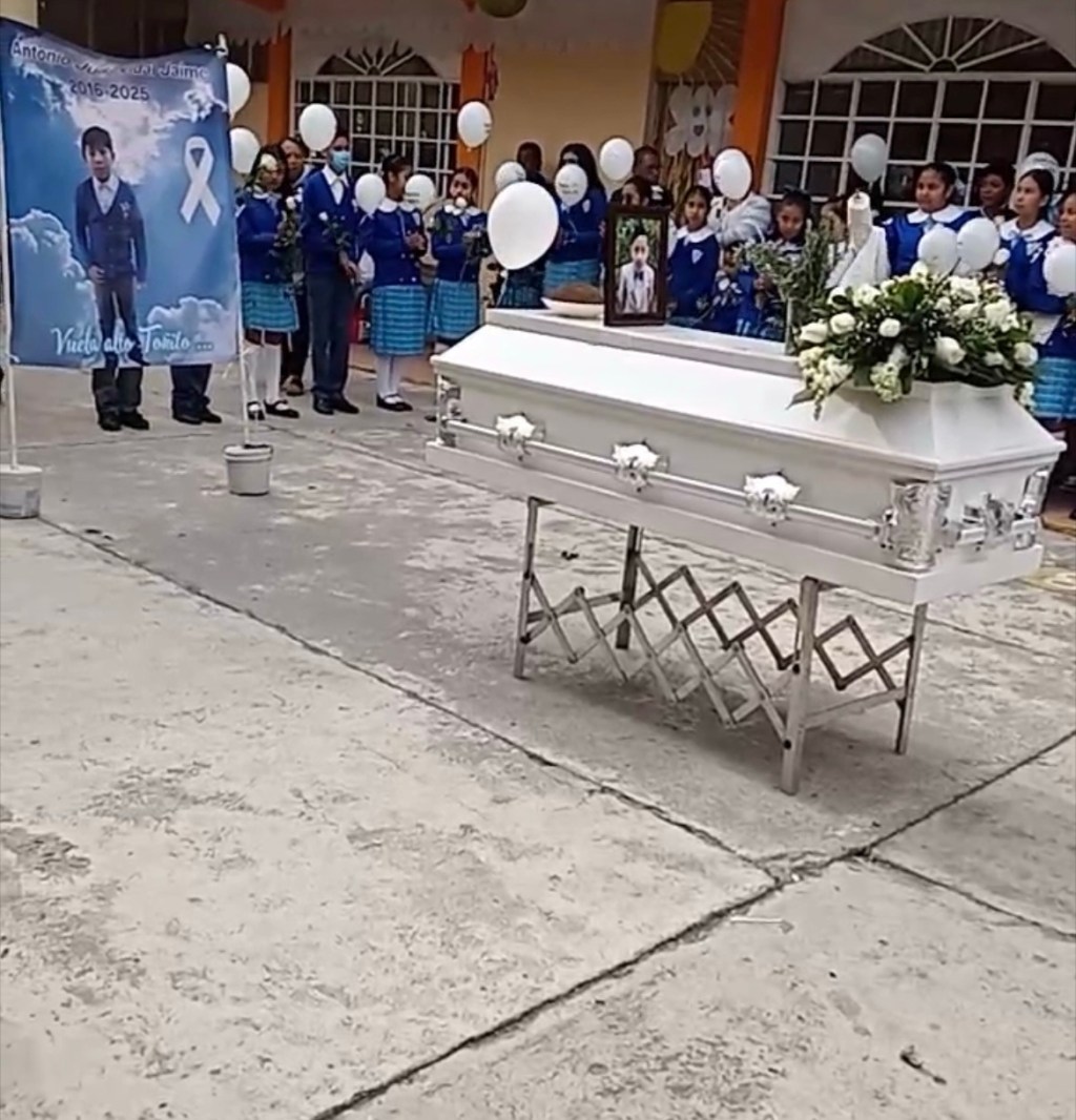 Triste: Despiden a Toñito en su escuela; sus compañeritos vistieron este sábado el uniforme escolar y llevaron globos blancos en el camino hacia en el cementerio de San Pedro Zictepec en Tenango del Valle.