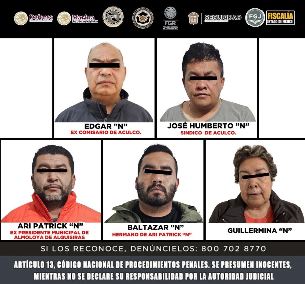 Cinco personas, entre ellas un síndico en funciones, un exalcalde, un excomisario y dos civiles, fueron detenidas en Atlacomulco, Almoloya de Alquisiras y Toluca por su presunta participación en delitos de extorsión vinculados con un grupo criminal originario de Michoacán.