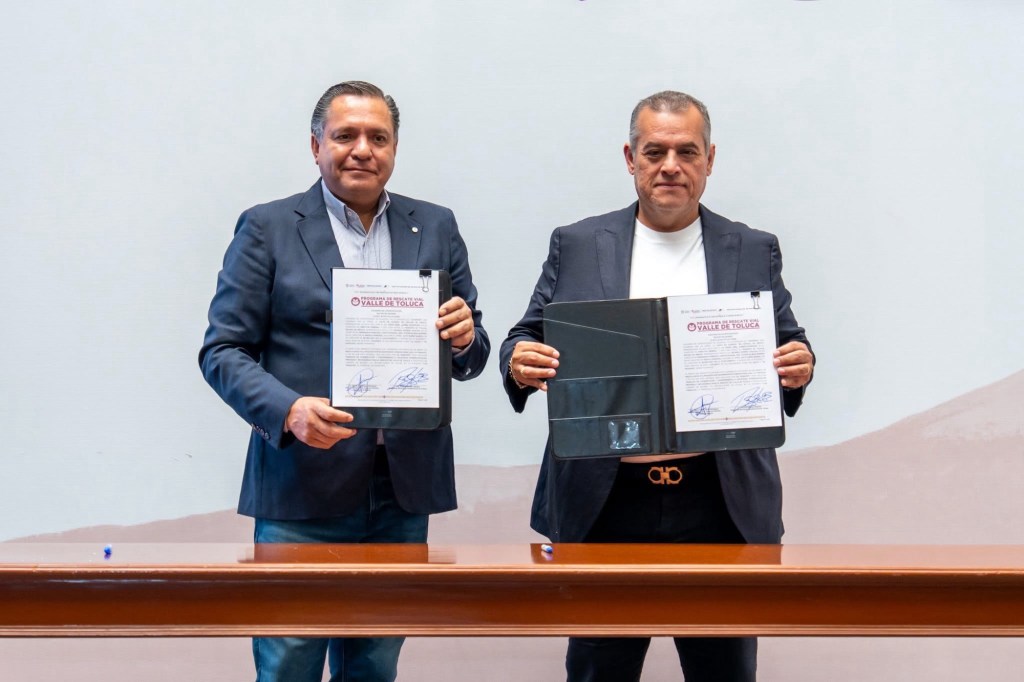 El alcalde de Toluca, Ricardo Moreno y el director de la Junta de Caminos del Estado de México, Ariel Juárez, firmaron el Proyecto de Rescate Vial para la zona de Toluca, con el cual se pretende bachear y reencarpetar las vialidades de jurisdicción estatal y municipal con mayor daño.