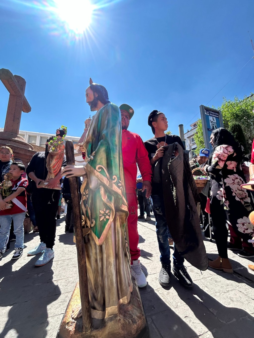 A la imagen enmarcada en marco de plástico tipo madera, a la estatua que mide casi el 1.70 metros o la estampida pegada en el celular o en o escapulario, se le llevó este día a misa y la bendecida en la iglesia de la Santa Veracruz del centro de Toluca.